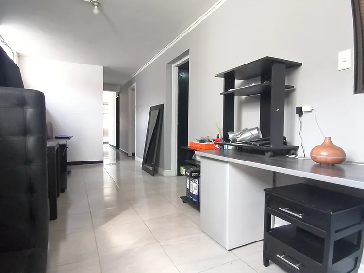 Consta de balcón, 3 habitaciones + servicio, 2 baños, Cocina en material, zona de ropas, y patio
